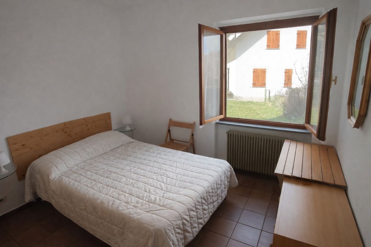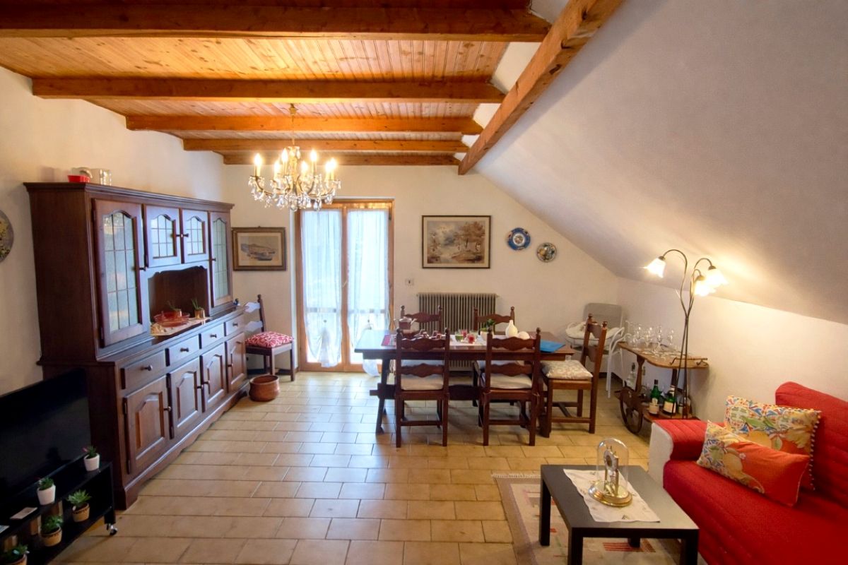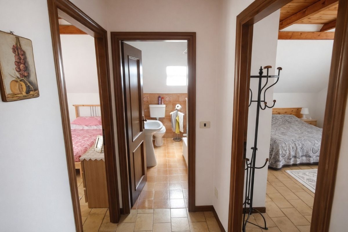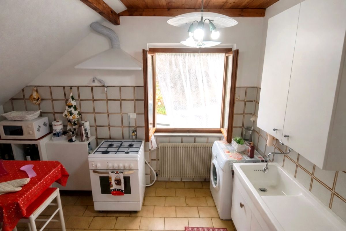 L’appartamento al primo piano, mansardato, accessibile tramite scala esterna, è composto da zona giorno con salotto e angolo cottura in ambiente open space; dal soggiorno si accede tramite porta finestra a un’ampia balconata con vista dominante sulla valle, sulla quale affaccia anche la camera principale, anch’essa dotata di porta finestra. Completano il piano una seconda camera da letto e un bagno con lucernario. Presente inoltre un vano sottotetto esplorabile, attualmente non sfruttato.