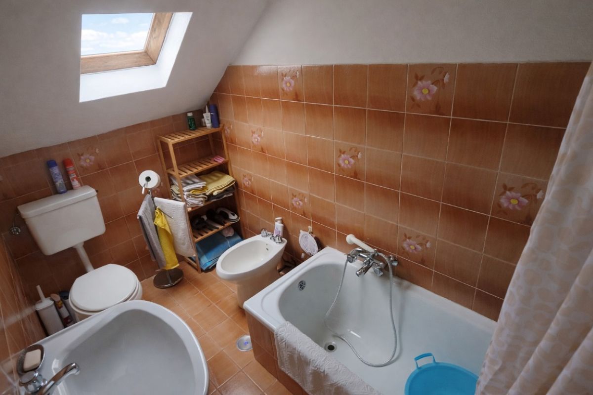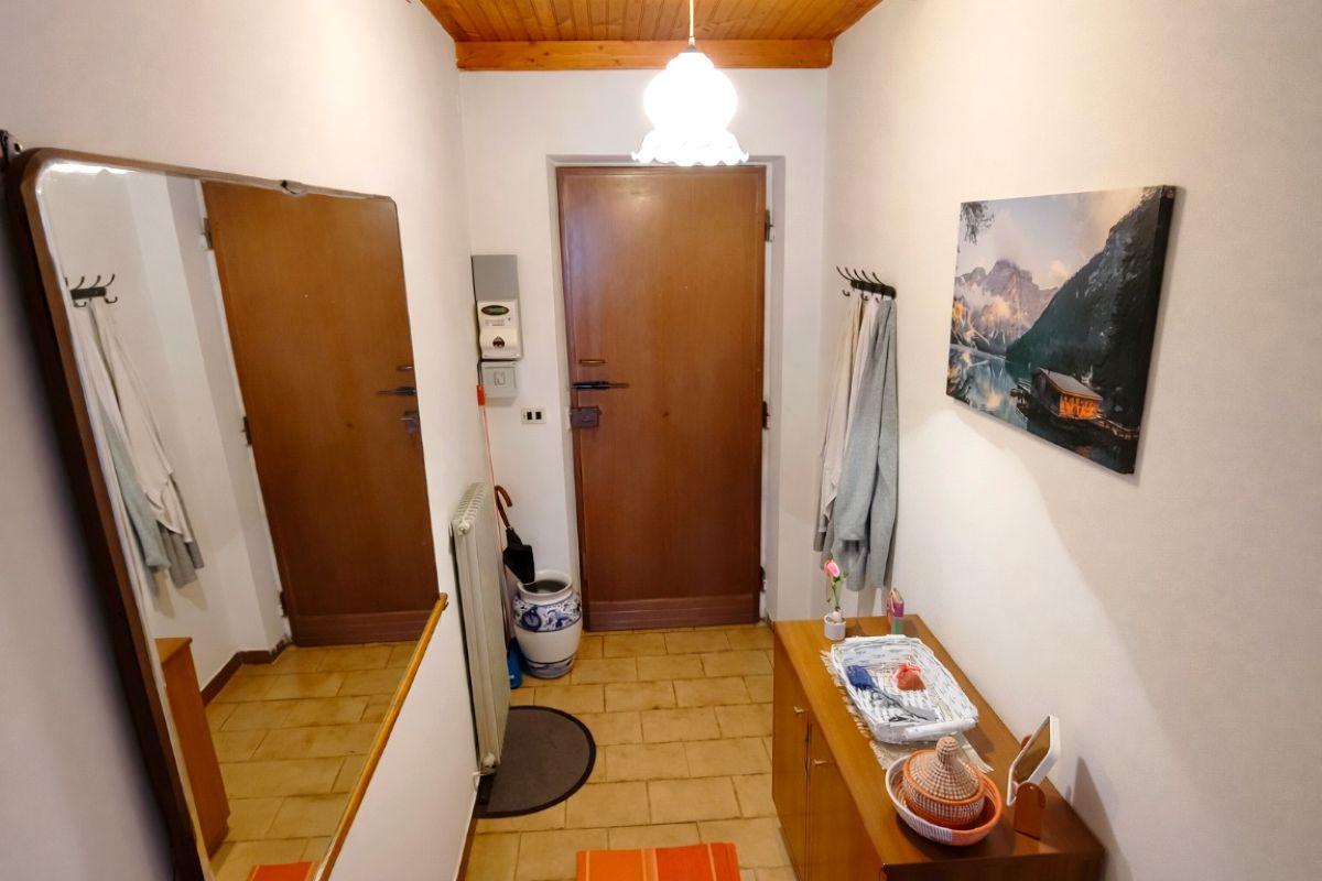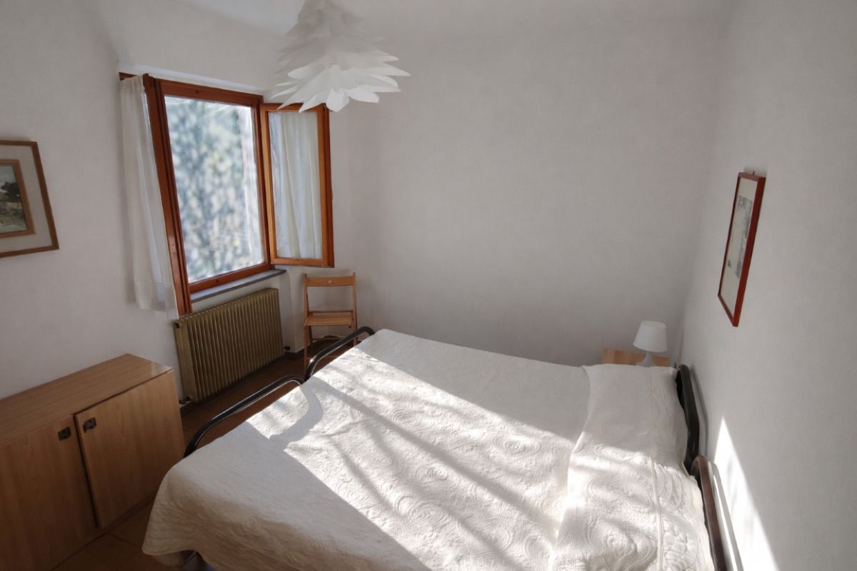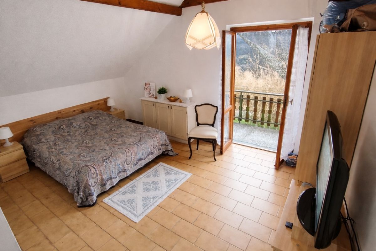 L’appartamento al primo piano, mansardato, accessibile tramite scala esterna, è composto da zona giorno con salotto e angolo cottura in ambiente open space; dal soggiorno si accede tramite porta finestra a un’ampia balconata con vista dominante sulla valle, sulla quale affaccia anche la camera principale, anch’essa dotata di porta finestra. Completano il piano una seconda camera da letto e un bagno con lucernario. Presente inoltre un vano sottotetto esplorabile, attualmente non sfruttato.